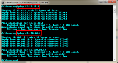Coba kita uji dengan tes ping menggunakan CMD ping 12.12.12.1 dan ping 10.100.10.1